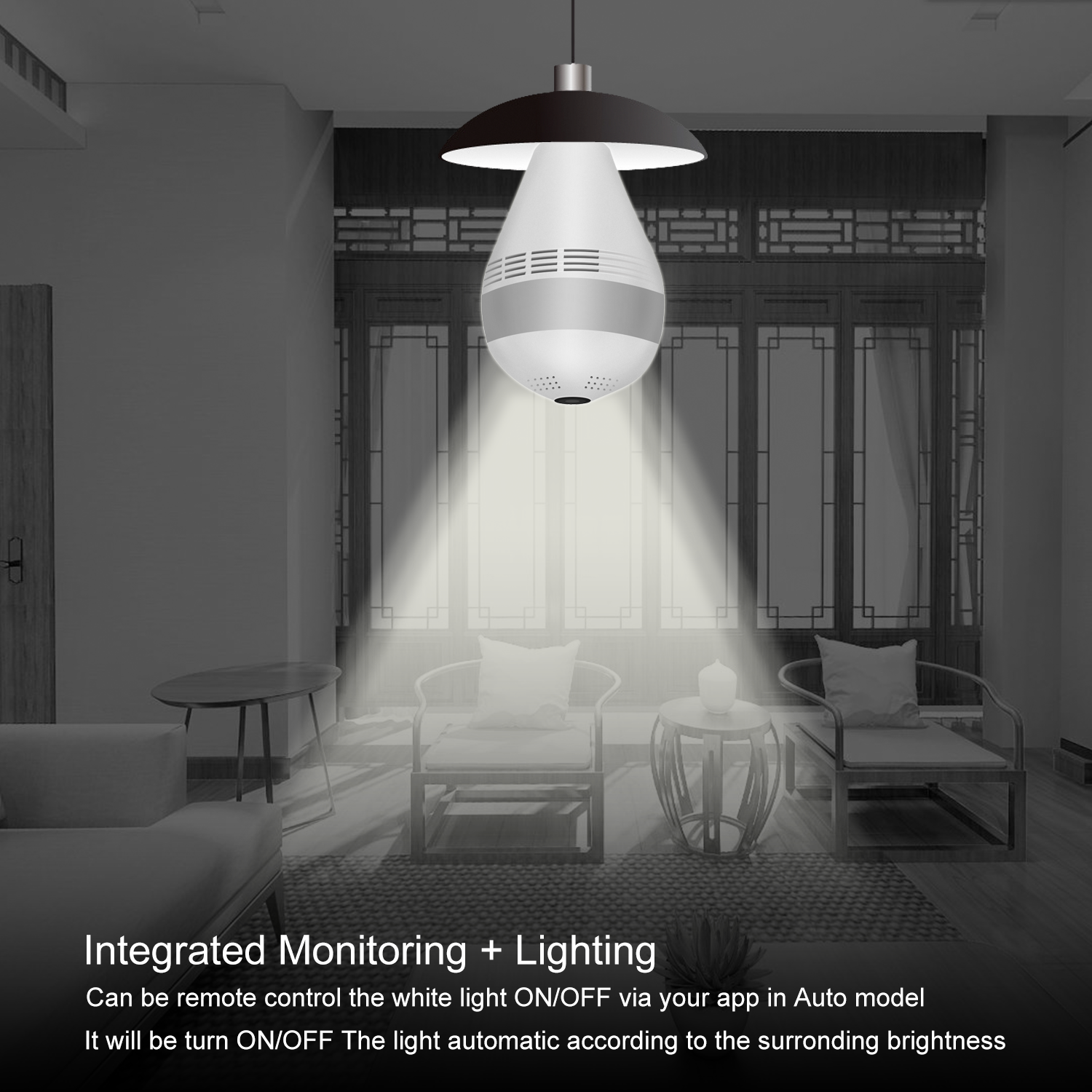 IR-CUT switch Automatic,about 5-8meters (It varies from environment) White Led can be remote control via APP:①Turn ON ②Turn OFF ③ Auto (In automatic mode, the infrared light will be turned ON after the IR-cut switch to night vision automatically , it can intelligently detected human body, and Turn ON/OFF the White light intelligently )